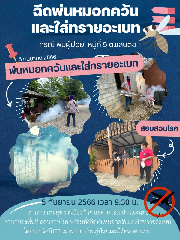 วันที่ 5 กันยายน 2566 งานสาธารณสุข และงานป้องกันและบรรเทาสาธารภัย ร่วมกับ รพ.สต.บ้านแสนตอ ดำเนินการฉีดพ่นหมอกควันและใส่ทรายอะเบท ในรัศมีโดยรอบบ้านผู้ป่วย เพื่อควบคุมโรค เนื่องจากพบผู้ป่วย จำนวน 1 รายในพื้นที่ หมู่ที่ 5 ตำบลแสนตอ