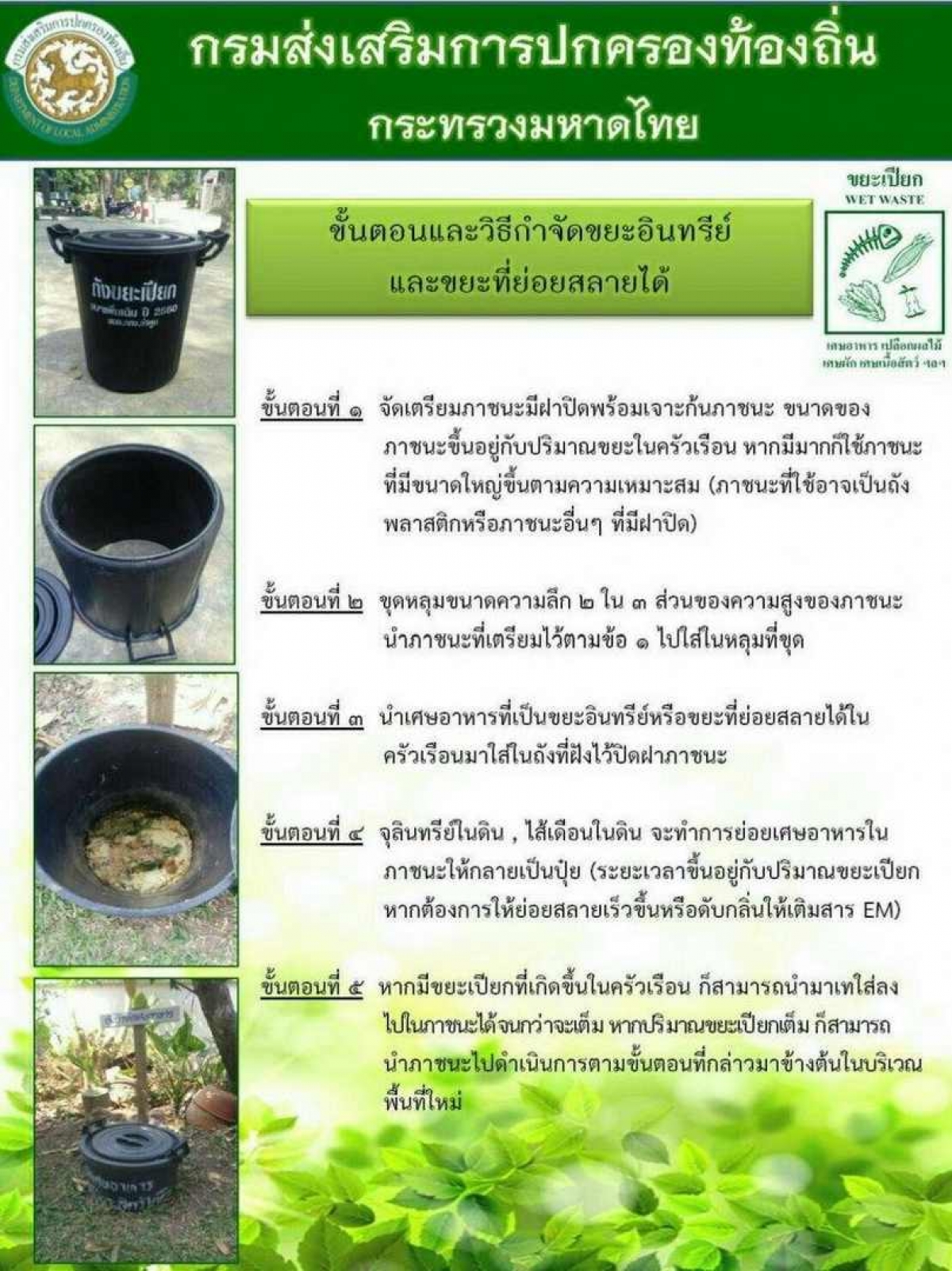 4. เมื่อปริมาณขยะเศษอาหารสูงถึงระดับเดียวกับดินที่ขุด ให้ฝังกลบ และย้ายที่ตั้งถัง