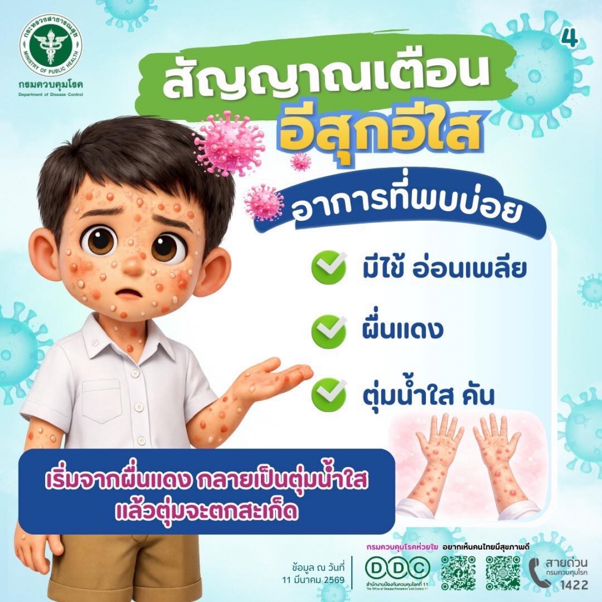 สังเกตอาการ: มีผื่นแดง ตุ่มใส คันตามตัว และอาจมีไข้ร่วมด้วย