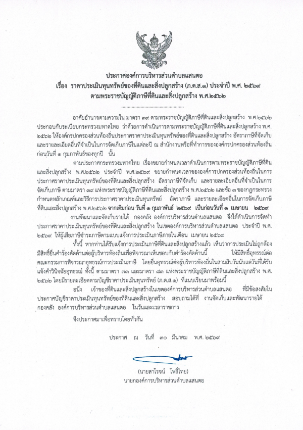 ประกาศราคาประเมินทุนทรัพย์ของที่ดินและสิ่งปลูกสร้าง (ภ.ด.ส.1) ประจำปี พ.ศ.2569 ตามพระราชบัญญัติภาษีที่ดินและสิ่งปลูกสร้าง พ.ศ.2562